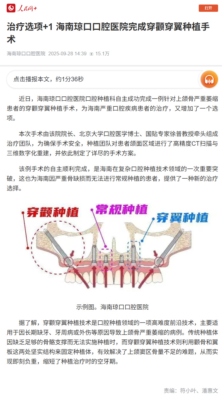 近日,人民网客户端刊发题为《治疗选项+1 海南琼口口腔医院完成穿颧穿翼种植手术》,报道了琼口口腔医院口腔种植科自主成功完成一例针对上颌骨严重萎缩患者的穿颧穿翼种植手术。